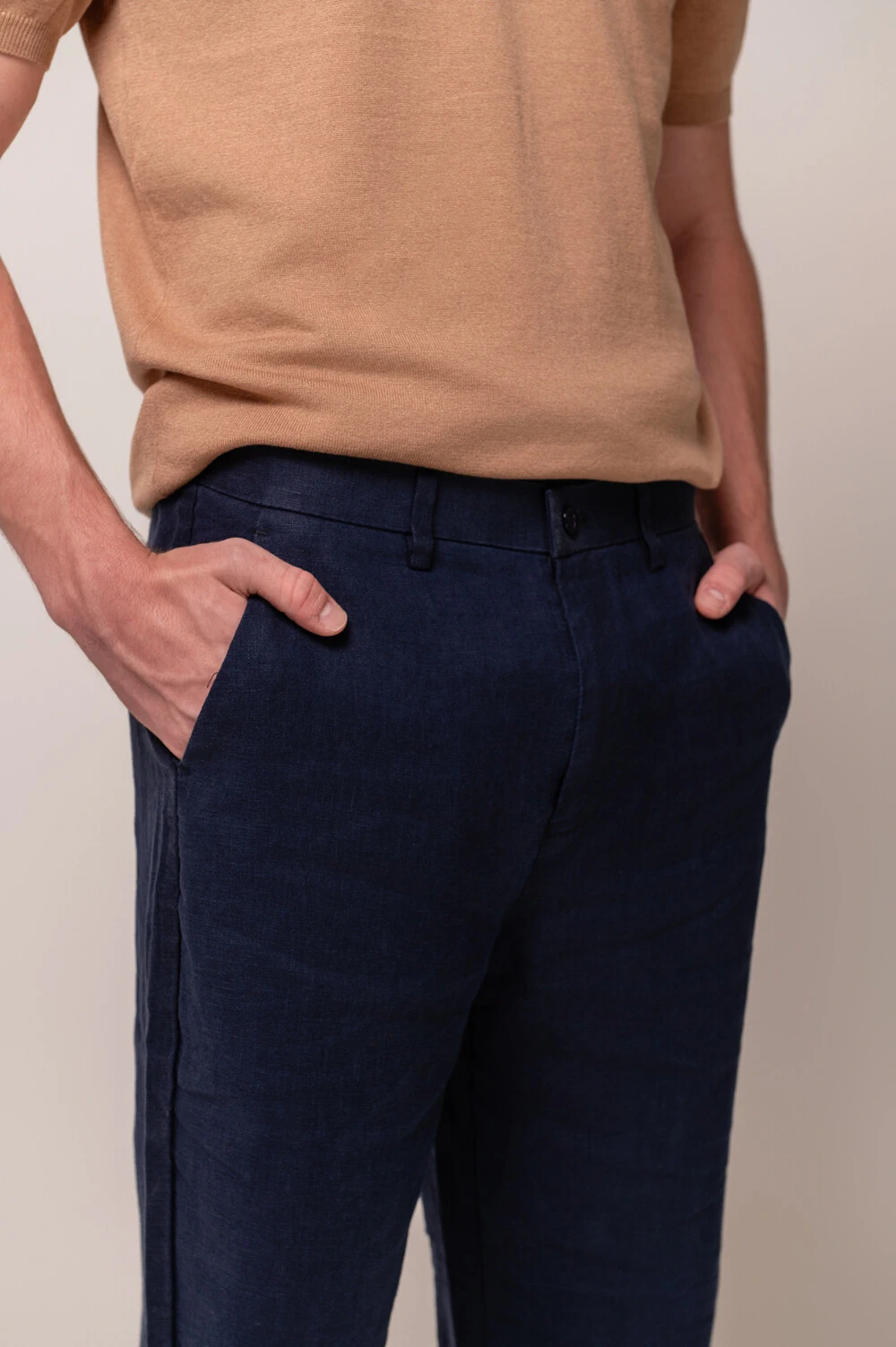 Confeccionada em 100% linho, um dos tecidos mais nobres e tradicionais da alfaiataria, proporciona alta respirabilidade, toque suave e uma sensação térmica fresca ao longo do dia. Sua estrutura leve e fluida garante um caimento impecável, que acompanha o movimento com conforto e discrição.